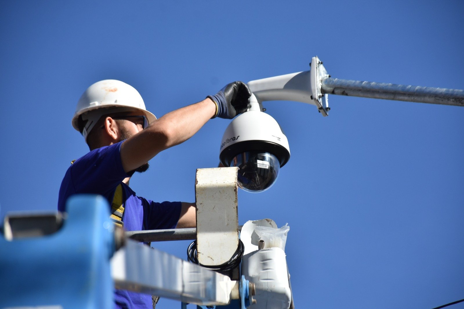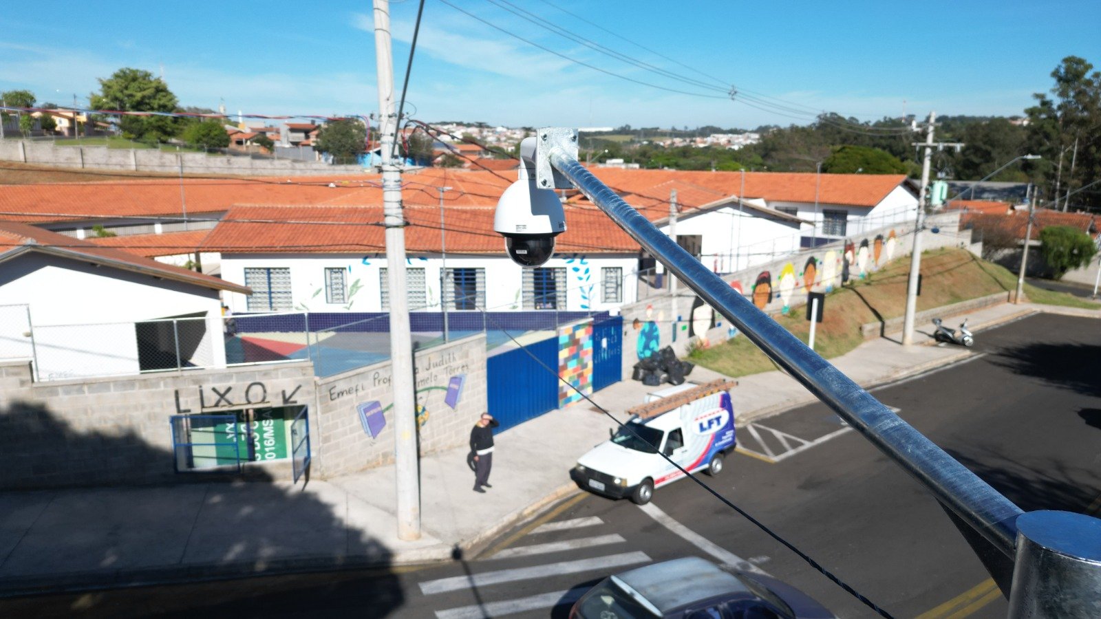 Estão sendo instaladas as 40 câmeras do tipo PTZ em frente escolas públicas da Cidade. Os equipamentos permitirão o monitoramento principalmente da área externa de escolas e também das vias públicas.