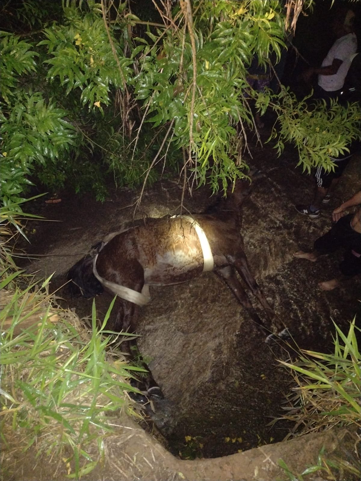 Populares acionaram os bombeiros após verificarem que o cavalo não conseguia sair do buraco, de mais de três metros de profundidade. Foi necessário fazer o içamento do animal com apoio de máquina cedida pela Prefeitura.