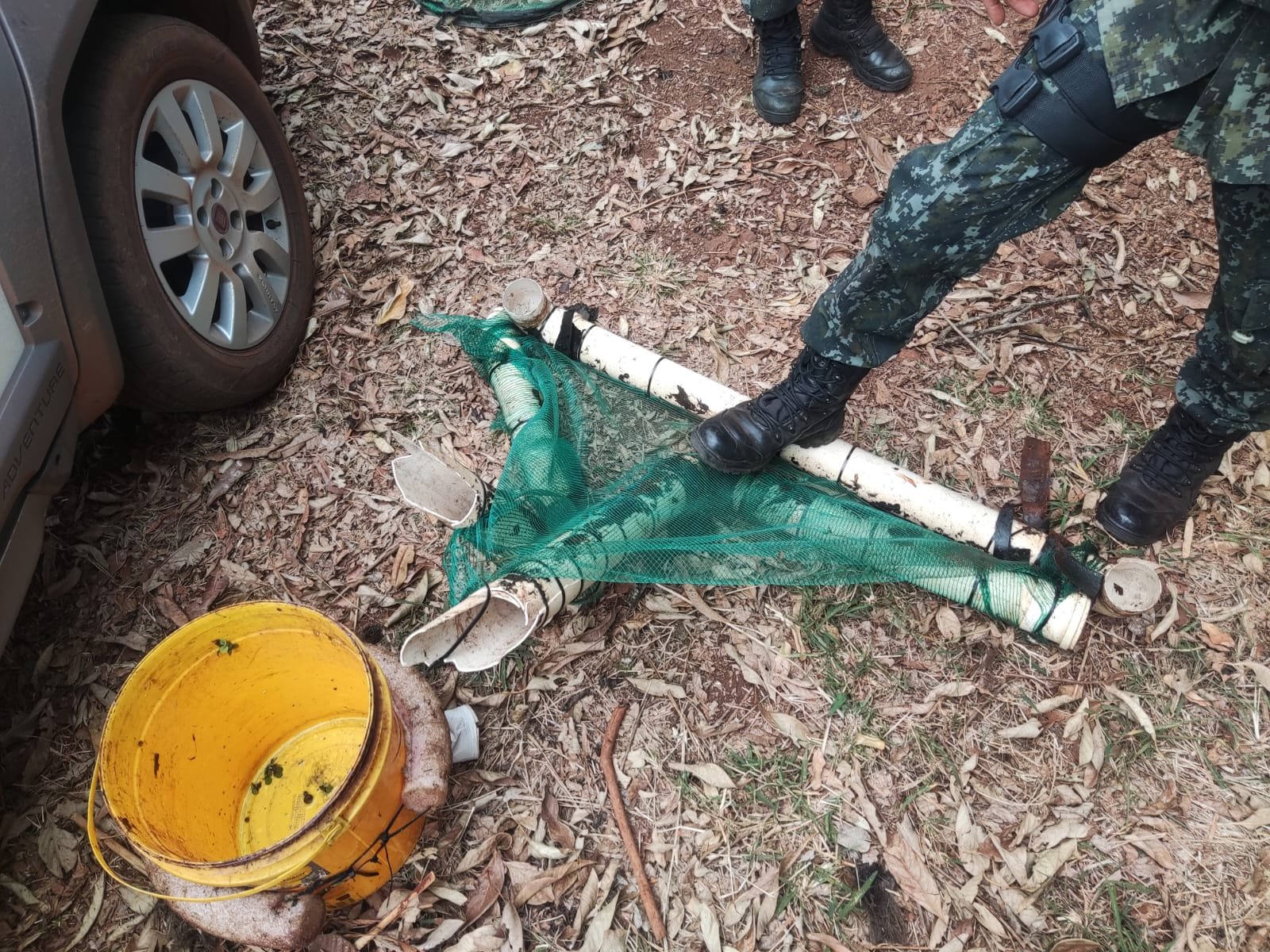 Alguns metros dentro da mata, dois homens foram encontrados usando artefatos conhecidos como “peneirão”. Em um balde estavam peixes da espécie Tuvira (Gymnotus spp), totalizando 300 gramas do pescado.