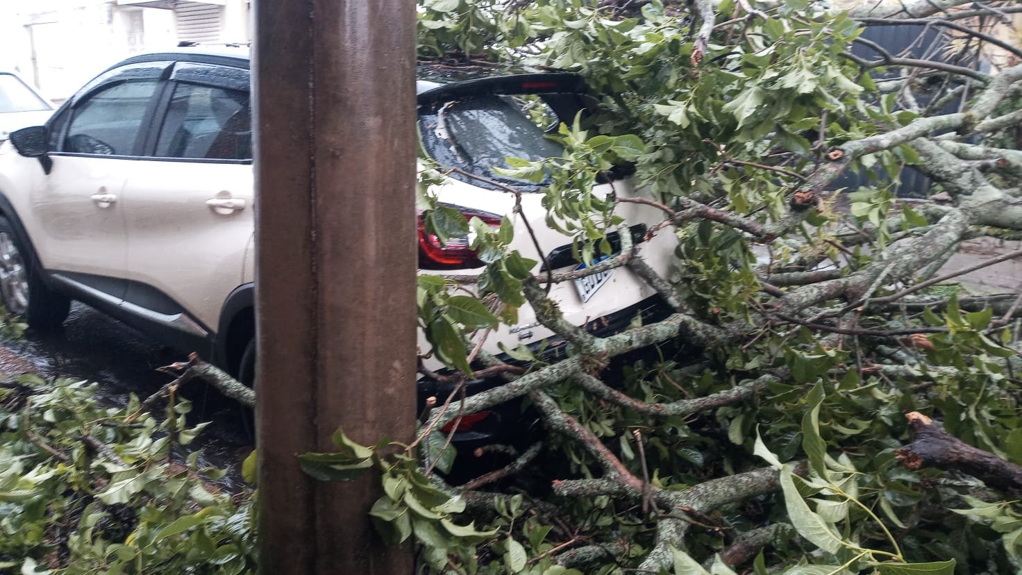 No cruzamento entre as Ruas Costa Leite e Coronel Vitoriano Villas Boas, no Centro, uma árvore caiu completamente, arrancando a raiz. Parte dos galhos e tronco atingiram um Renault Captur. Não houve feridos.