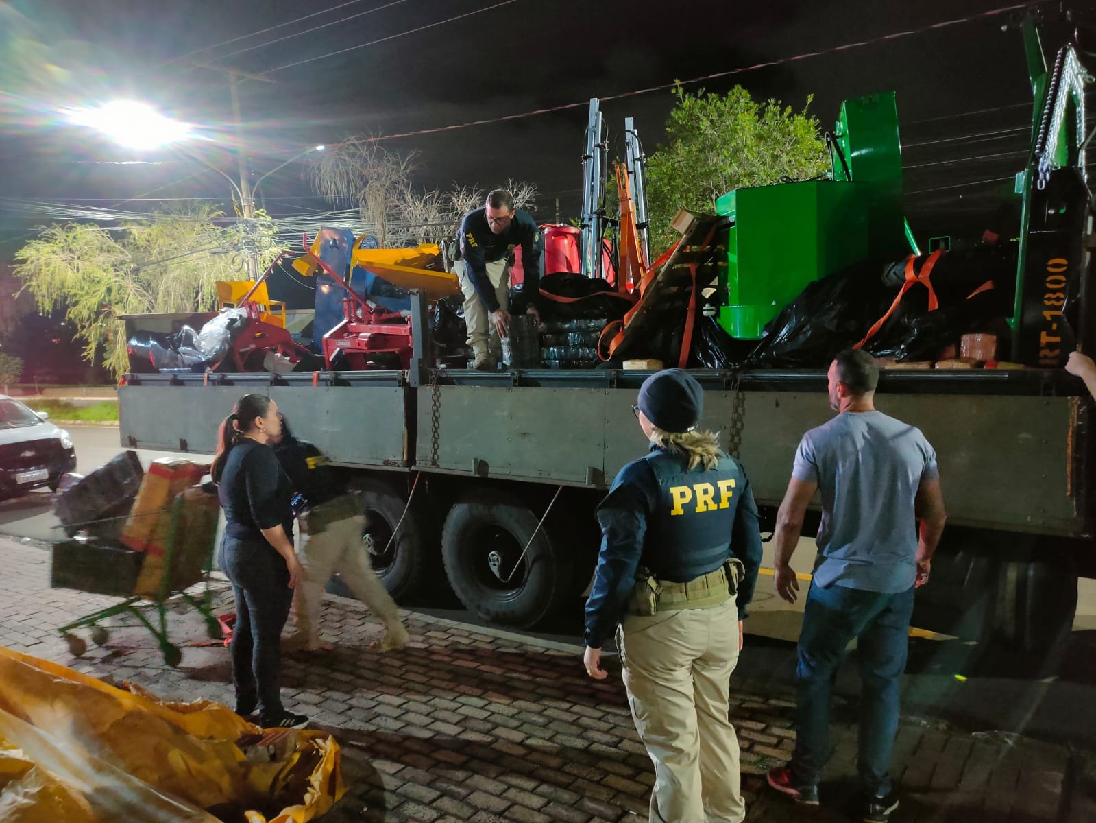 Ao realizarem vistoria no veículo foram encontrados diversos fardos de maconha, devidamente ensacados, em sacos pretos com fitas adesivas. Em meio a carga de máquinas de implementos agrícolas.