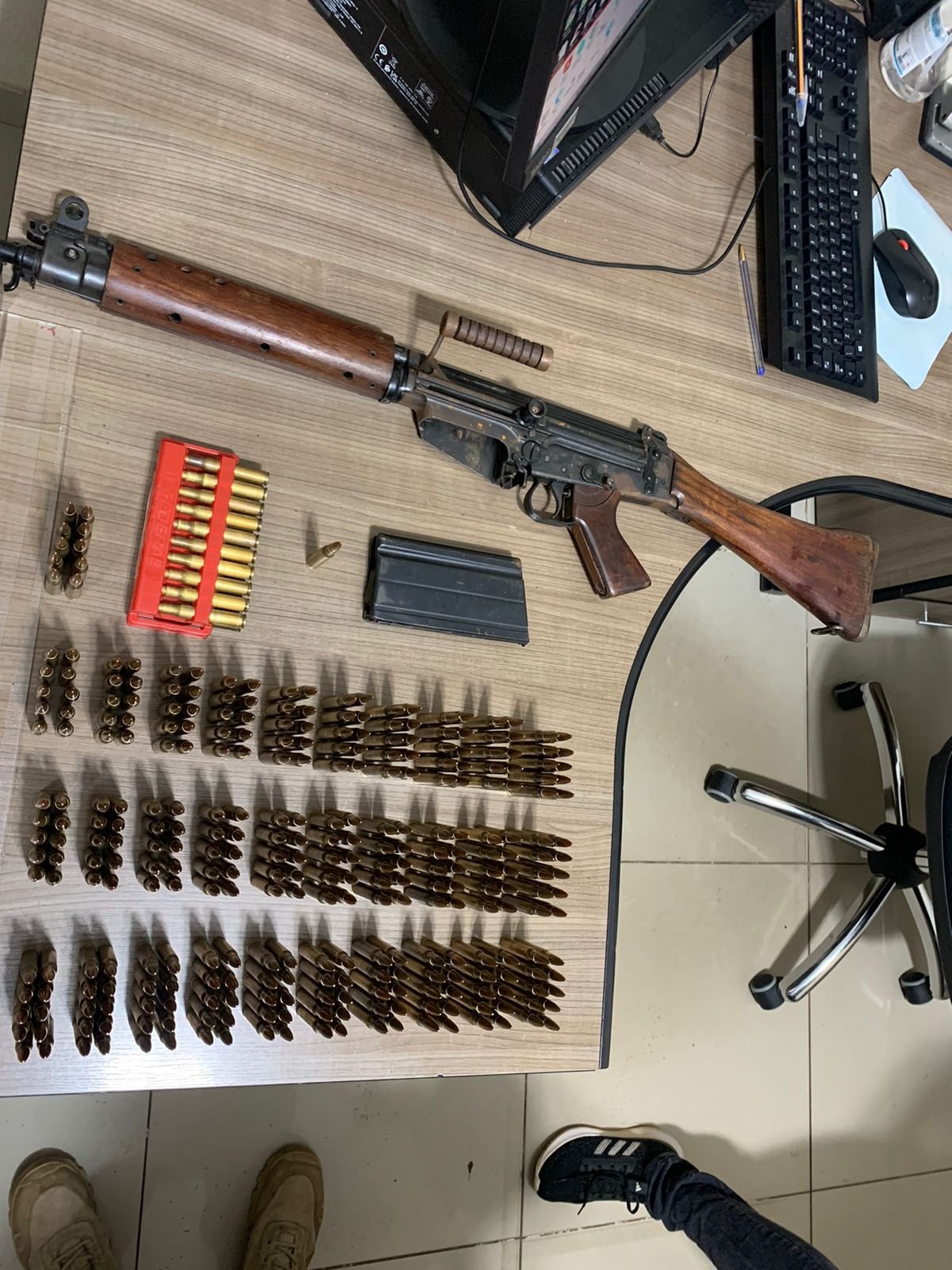 Com a dupla havia um fuzil Belga Calibre 7.62 e 331 munições. Ambos foram presos e levados até a Delegacia de Polícia Federal, em Marília.