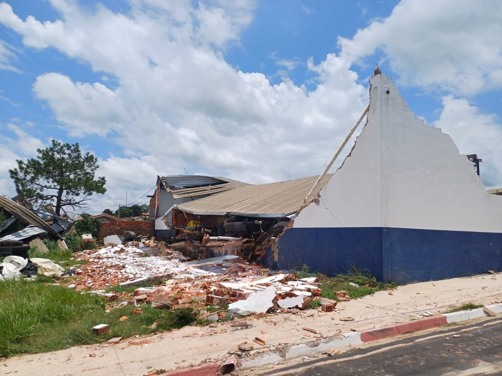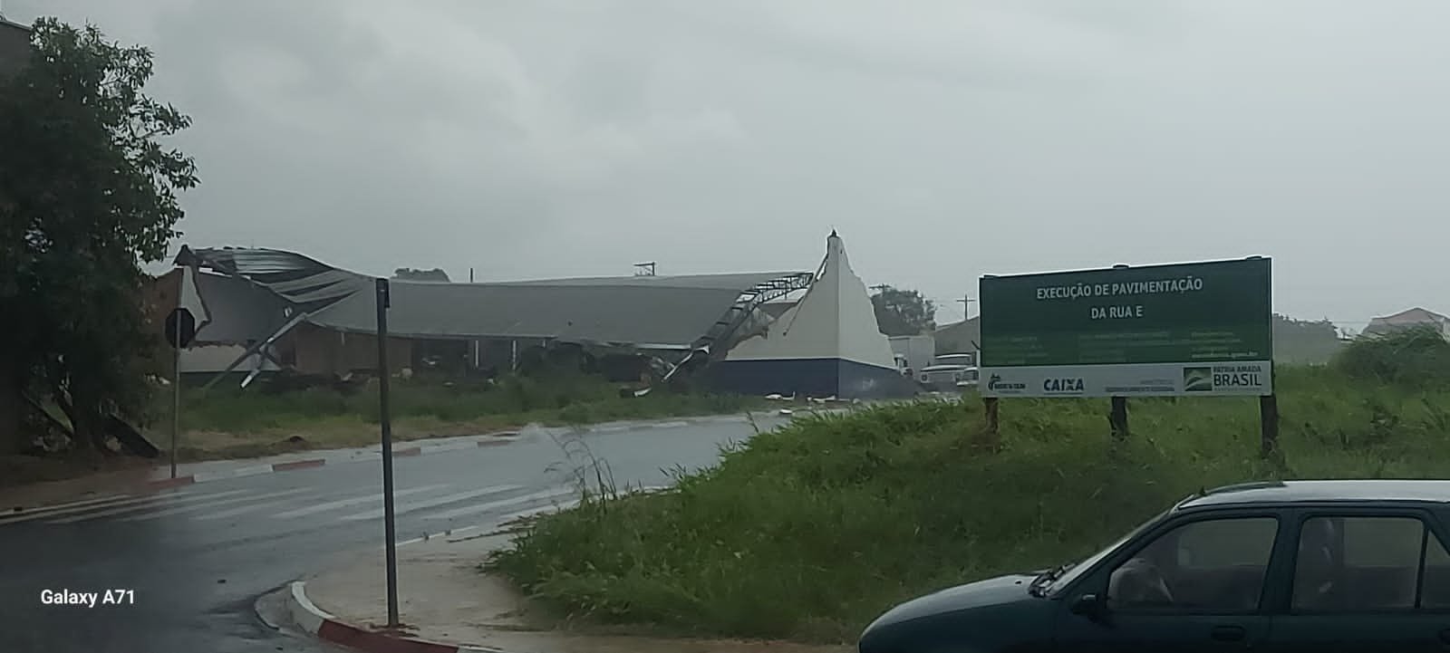 Um barracão particular teve a cobertura arrancada, fazendo com que a estrutura do imóvel ficasse danificada. O espaço é usado para guardar máquinas, mas não havia nenhuma na parte interna durante o temporal.