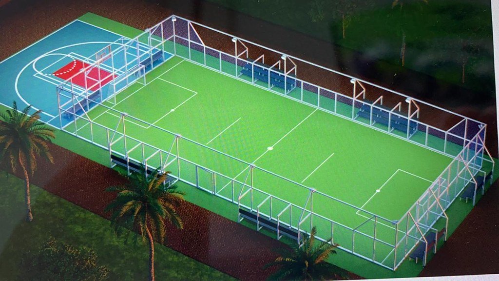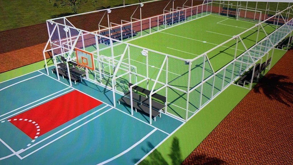 As arenas esportivas são compostas por quadra de futebol society, com iluminação e arquibancada, em uma área de 717,5 m², e quadra de basquete 3×3 de 307,5 m², com iluminação de LED.
