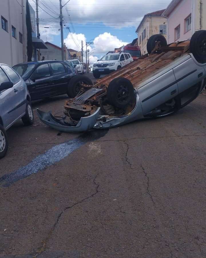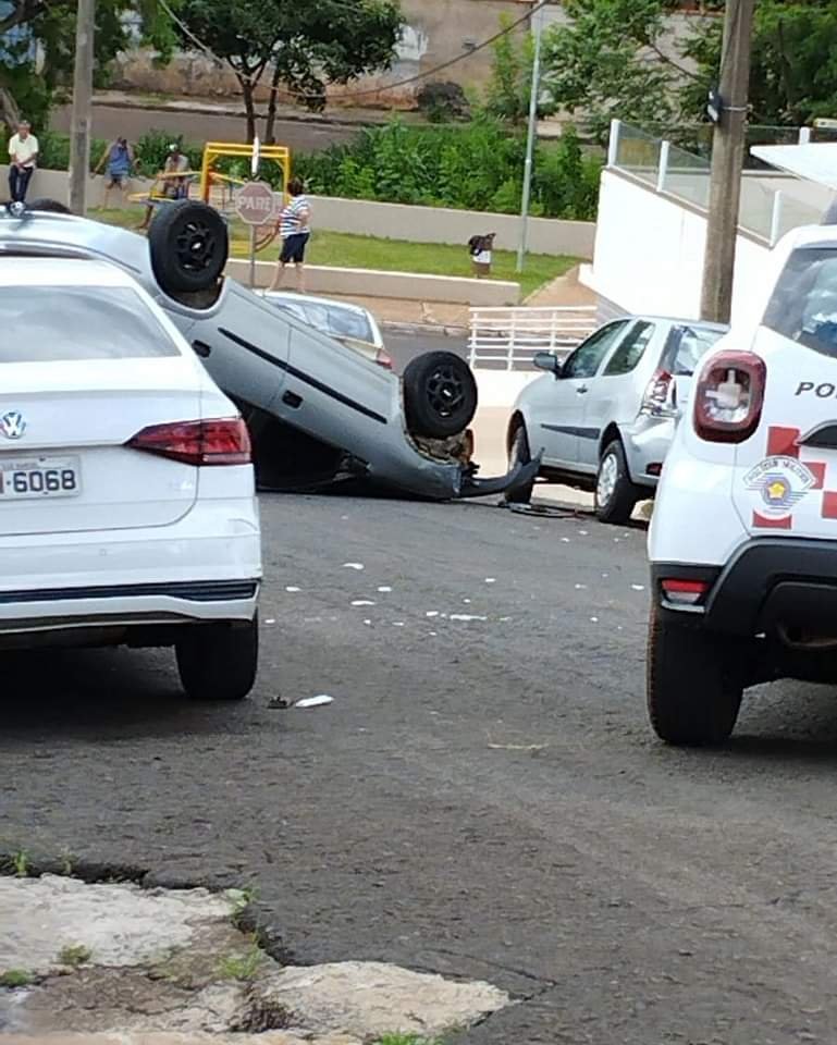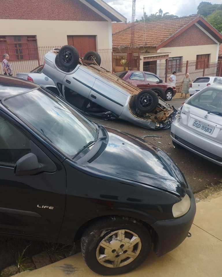 O carro colidiu contra outras dois veículo que estavam estacionados (Chevrolet Onix e Celta) quando houve a batida em um terceiro (um Fiat Palio), provocando o capotamento.