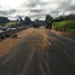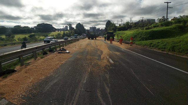 Carga de milho ficou espalhada pela rodovia, provocando interdição da pista contrária