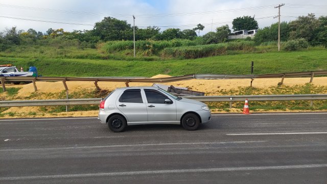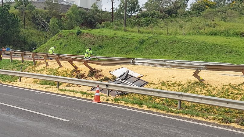 A carga de milho ficou espalhada pela rodovia, provocando interdição da pista contrária. Equipes da Polícia Rodoviária e concessionária estiveram no local para a retirada do veículo e da carga, que ficou espalhada pela pista.