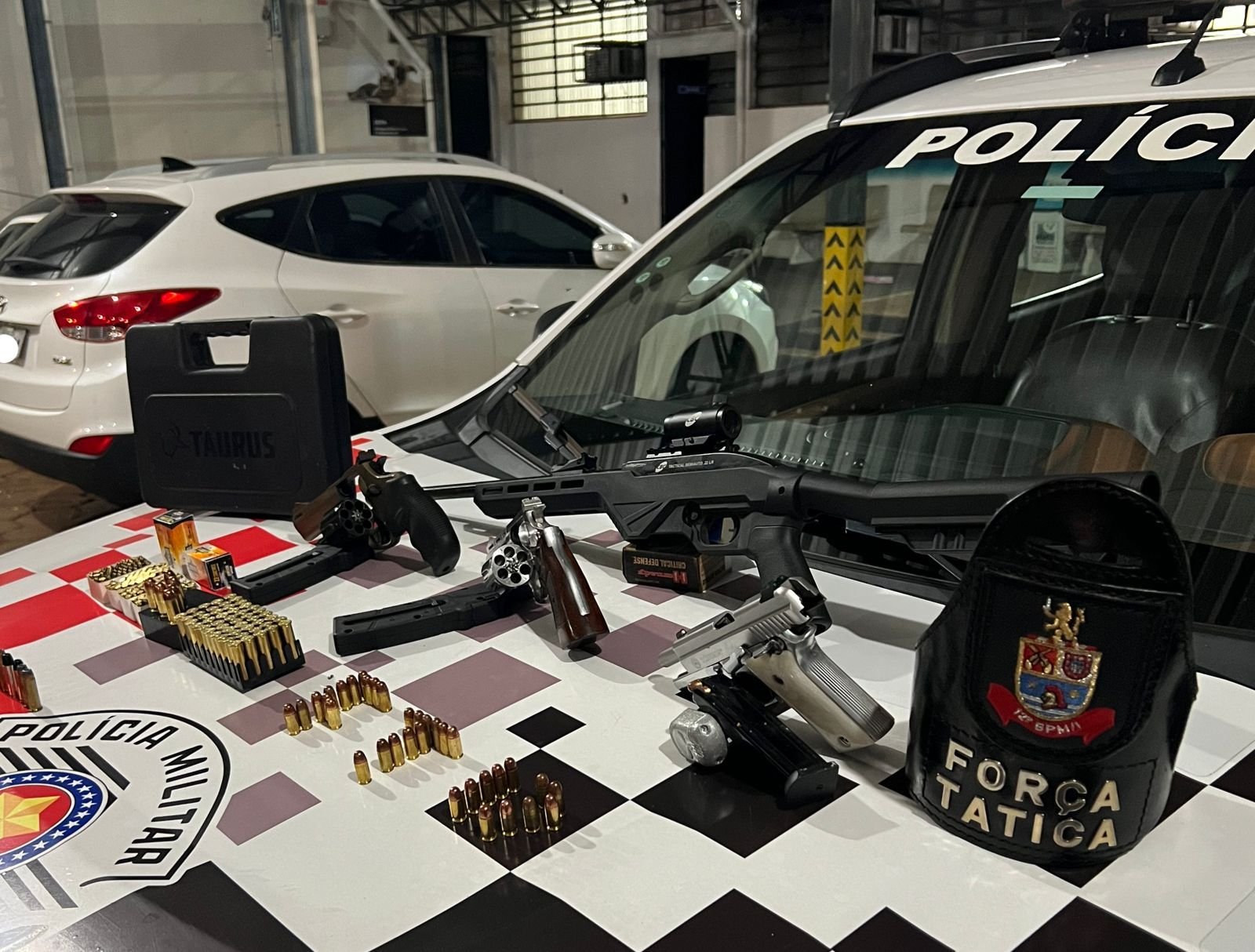 Detido, o homem ainda disse que havia mais drogas e armas em uma casa que alugava como depósito na Rua Juraci Thiago Retameiro, no Chácara Recreio Vista Alegre. Dentro de um móvel no banheiro estavam dois revólveres calibres 38 e 357, uma pistola calibre 38, um rifle calibre 22 com numeração suprimida e munições diversas.