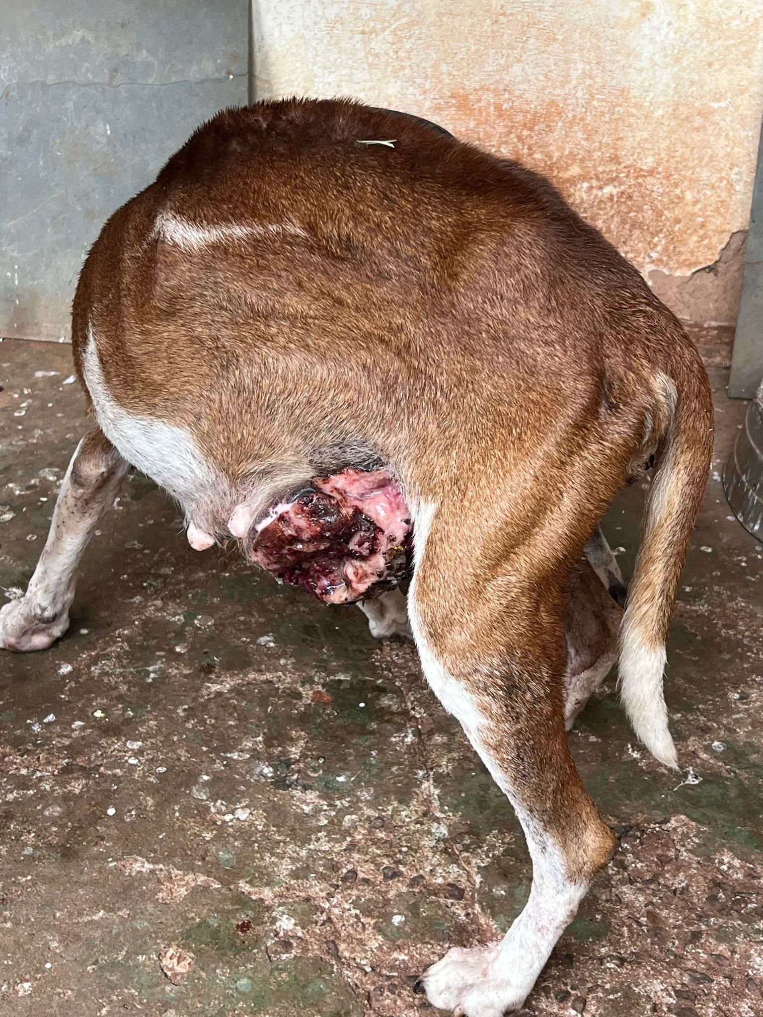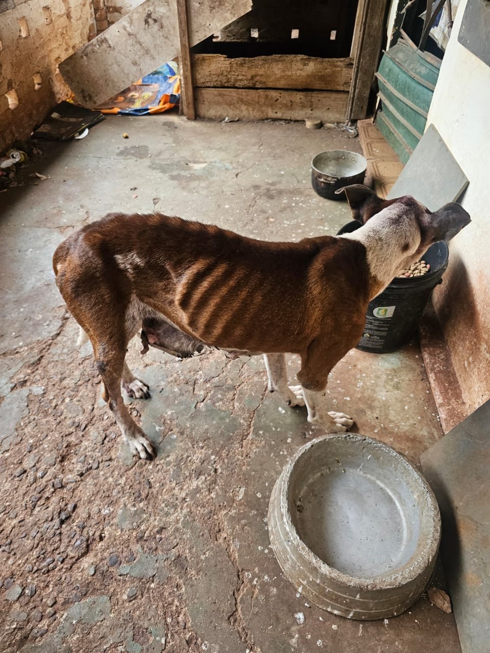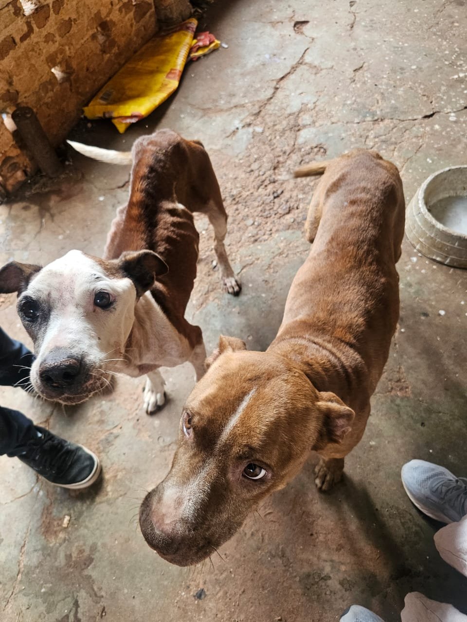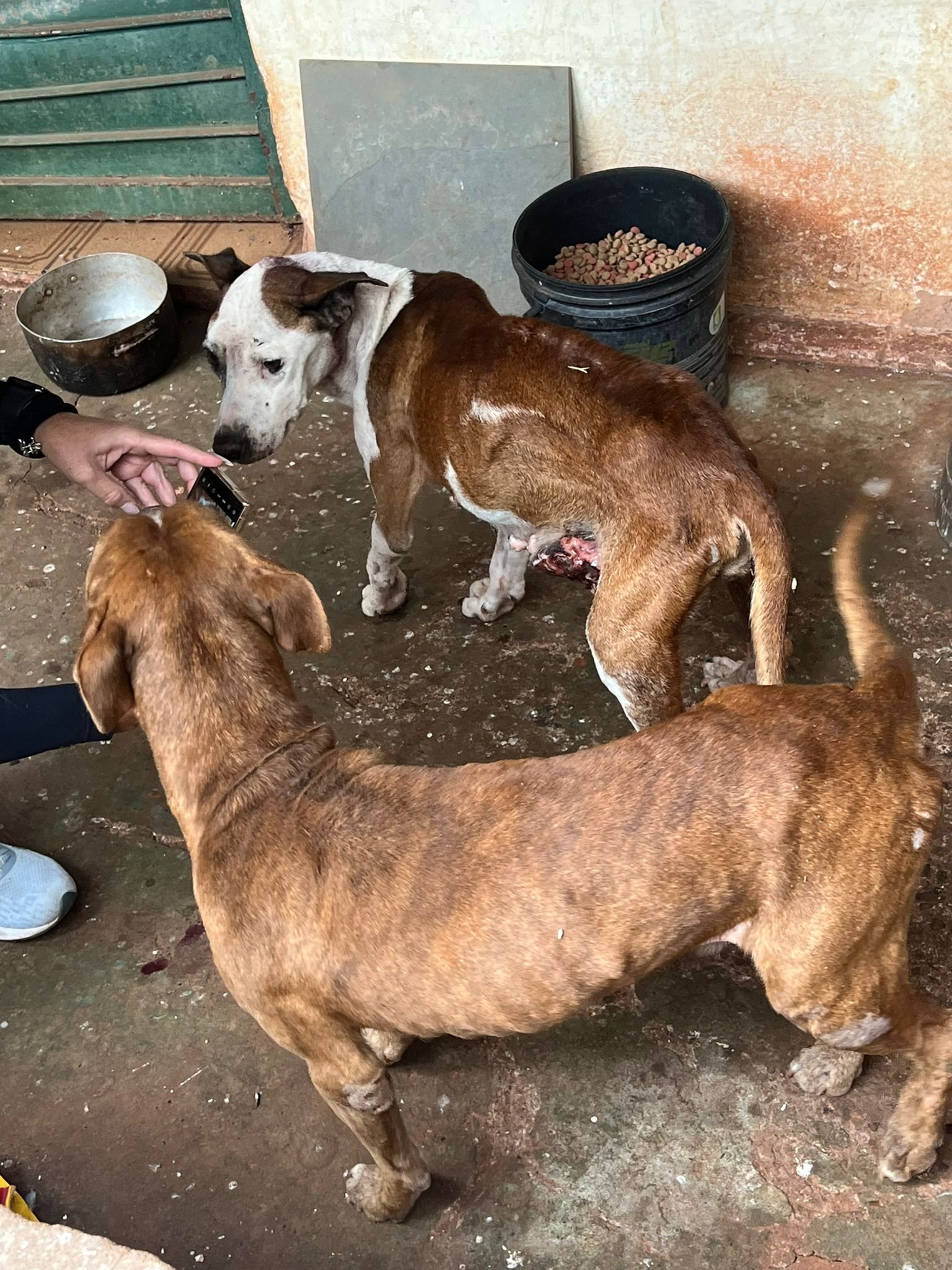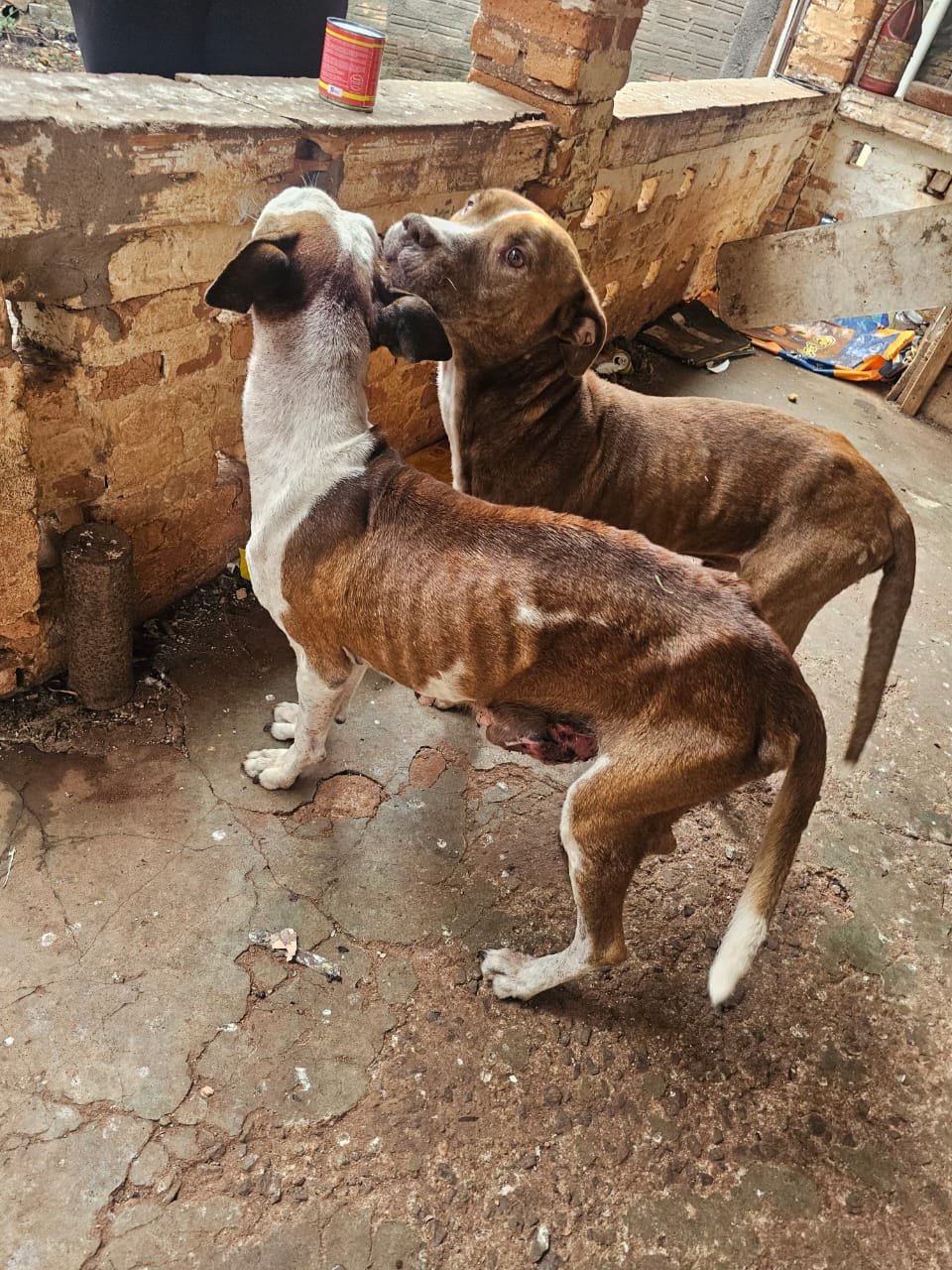 Os cães estavam em condição de extrema fragilidade, com vermes e alta infestação de pulgas e carrapatos. O macho apresentava extrema magreza e mioclonia, provavelmente por cinomose. A fêmea, também desnutrida e desidratada, apresentava tumores pela mama, com insetos nas feridas.