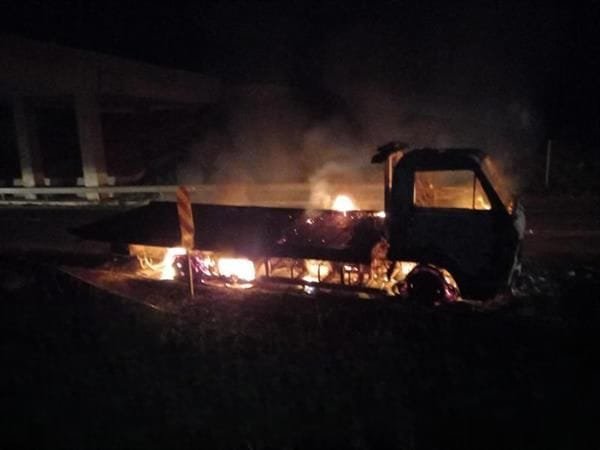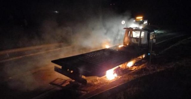 Um caminhão guincho ficou destruído após sofrer um incêndio na noite de quinta-feira, 6 de junho, no acesso da Rodovia Castello Branco (SP 280), em Bofete.