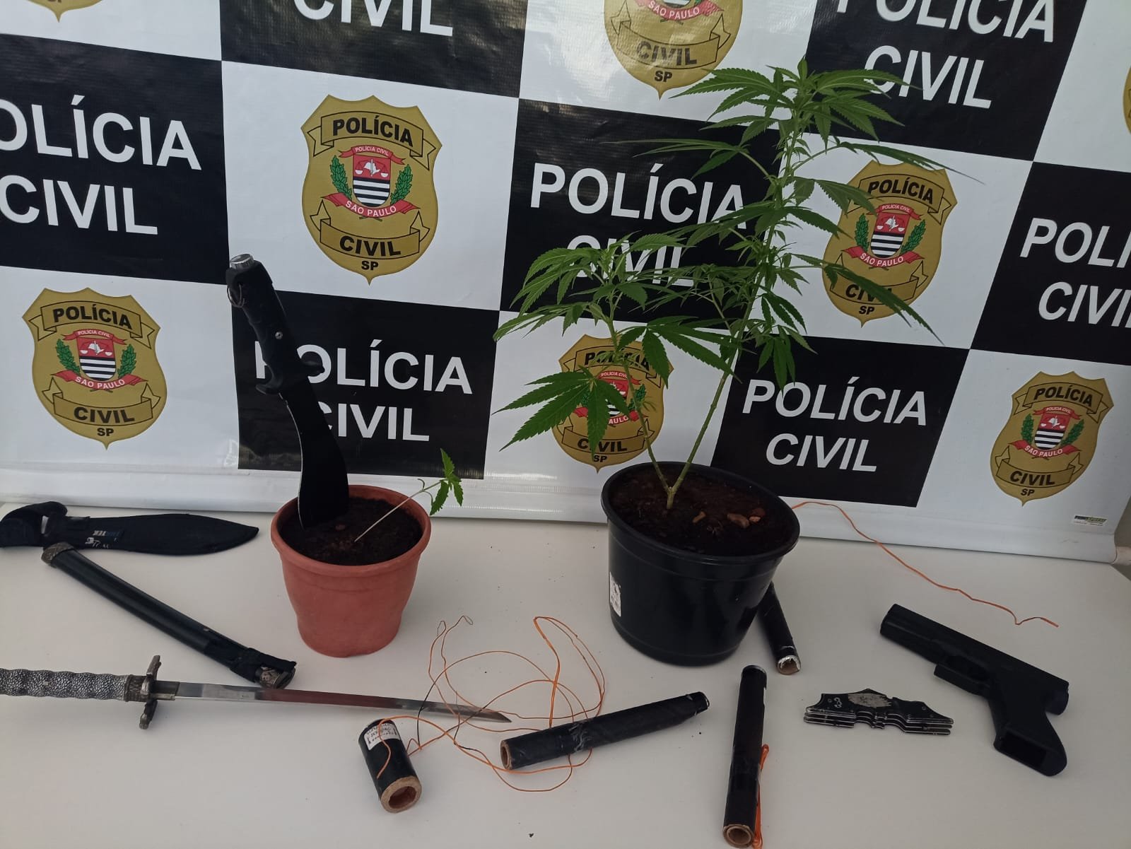 Em outra busca pelo complexo, houve a localização de mudas de cannabis sativa plantadas em vasos, além de simulacros de armas de fogo e apetrechos usados no tráfico.