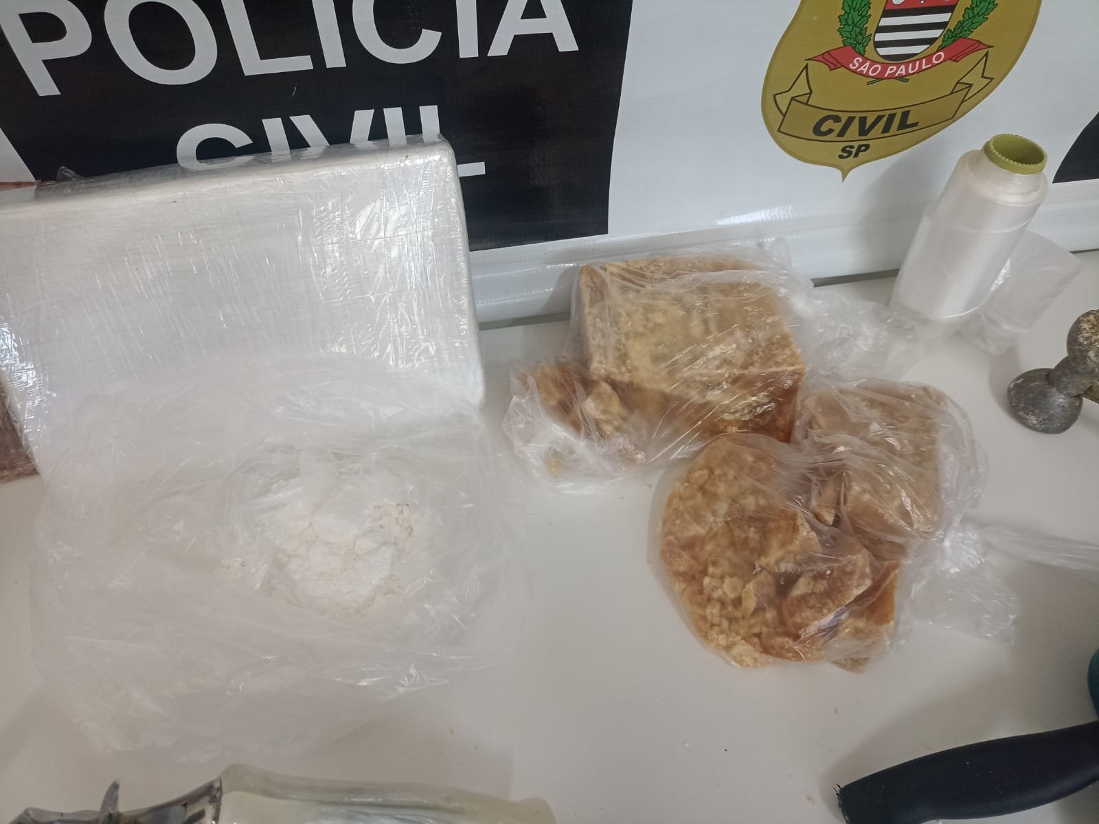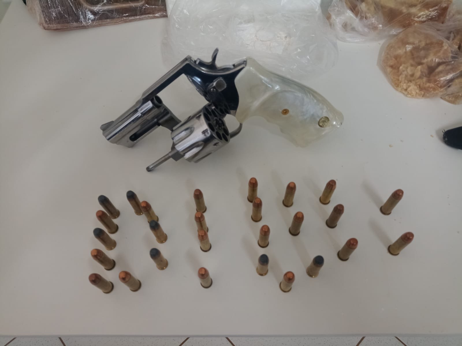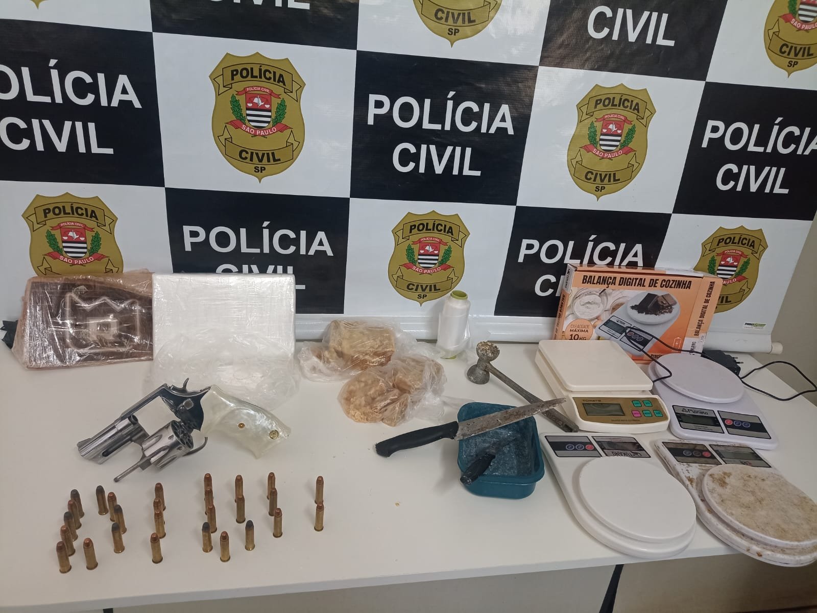 Durante a verificação ao imóvel foram encontrados um quilo de crack, um quilo de cocaína, quatro balanças de precisão, além de um revólver calibre 357, de uso restrito às Forças de Segurança.