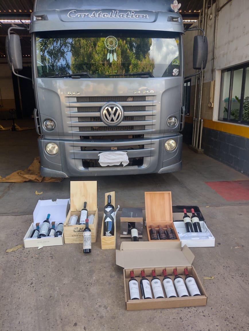 Na averiguação da carga foram encontradas caixas com 3.600 garrafas de vinho de diferentes marcas, sem qualquer tipo de documentação de compra ou importação.