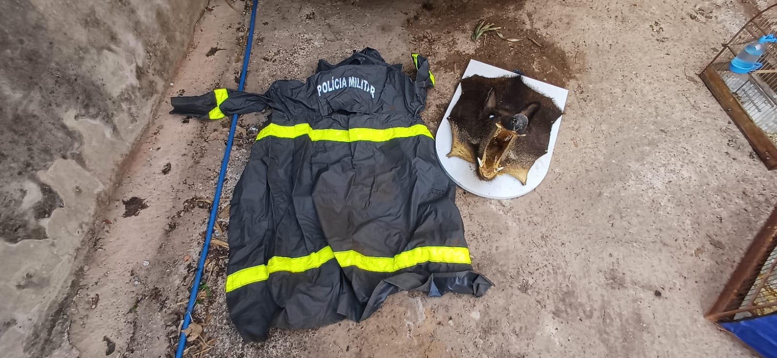 No cumprimento do mandado de busca e apreensão na residência do acusado foi encontrada uma espingarda, uma cartucheira com catorze cartuchos calibe 32, com um deles já deflagrado. Outras armas também acabaram recolhidas como uma machadinha, duas facas e um facão. Entre os demais objetos estavam sete coletes de caça para cachorros, uma pescoceira, além de capas de chuva, sendo que uma delas apresentava o logotipo da Polícia Militar.