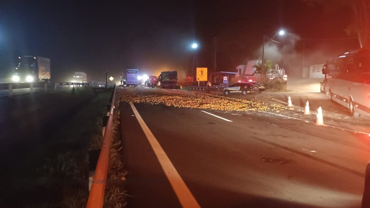 Naquele trecho houve a tentativa de ultrapassagem de uma carreta, carregada com 30 toneladas de laranjas, junto a outro caminhão. No entanto, a manobra foi mal sucedida, o que provocou a batida lateral no ônibus. Devido ao impacto, parte da carroceria tombou, fazendo com que parte da carga caísse na pista.