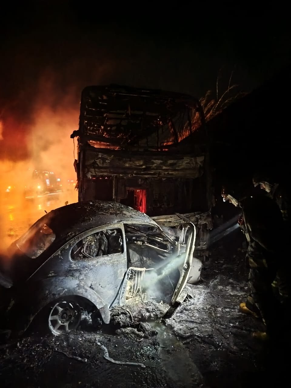 O Fusca colidiu de frente contra o ônibus. Com a batida e vazamento de combustível, as chamas começaram a tomar conta dos dois veículos. Os ocupantes do carro morreram na hora.
