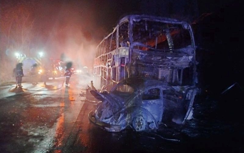 Carro e ônibus pegam fogo após colisão; duas pessoas morreram no acidente