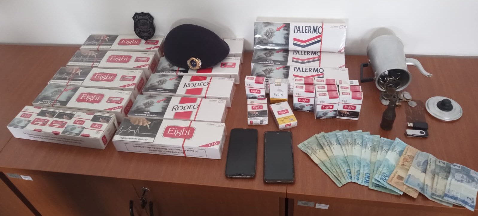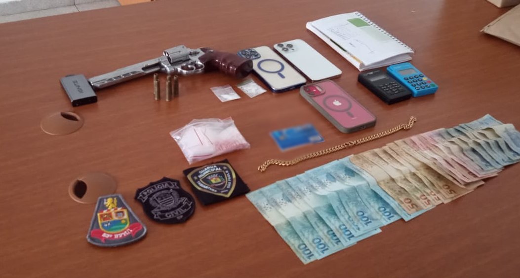 Foram apreendidas porções de cocaína, cerca de R$ 3 mil em dinheiro, além de cigarros contrabandeados, celulares, anotações que indicam a contabilidade do tráfico e diversos objetos possivelmente oriundos de furtos.