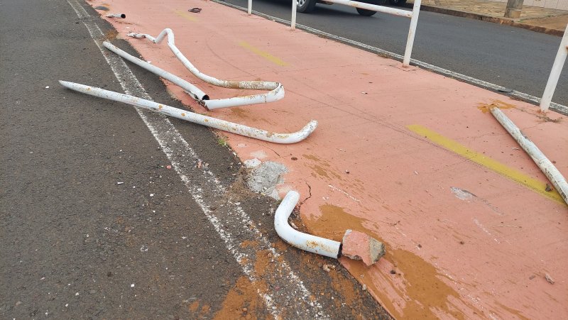 As nove estruturas de metal ficaram retorcidas ou mesmo arrancadas após a batida de uma caminhonete Fiat Strada. Vizinhos relataram que o fato ocorreu por volta das 5 horas.