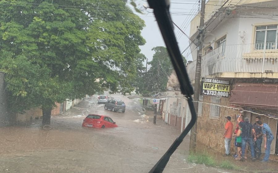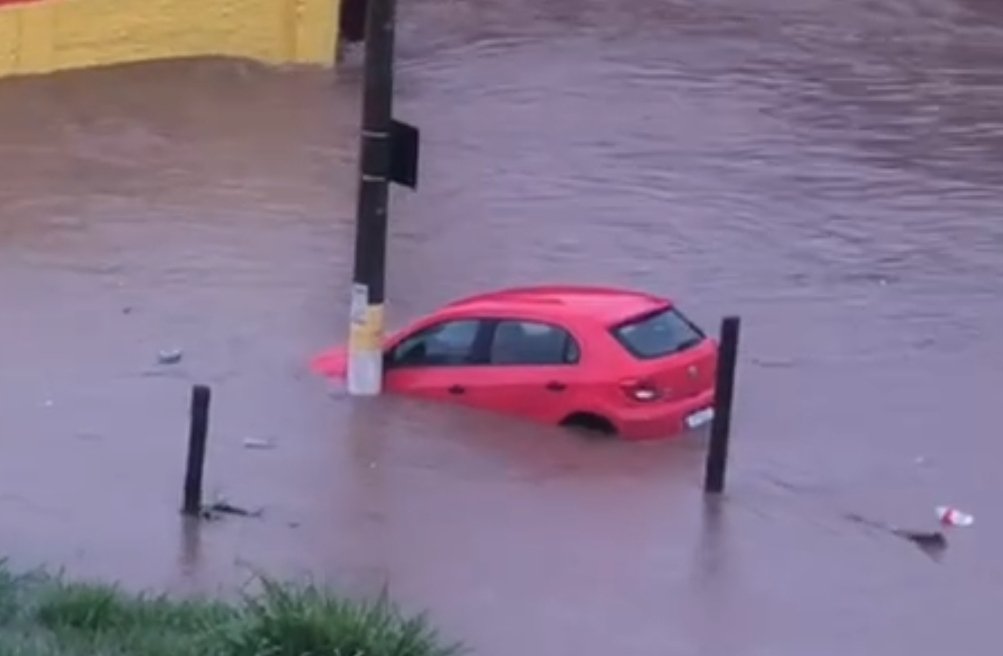 Na Rua Distrito Federal motorista não conseguiu escapar da enchente, ficando com o carro submerso.