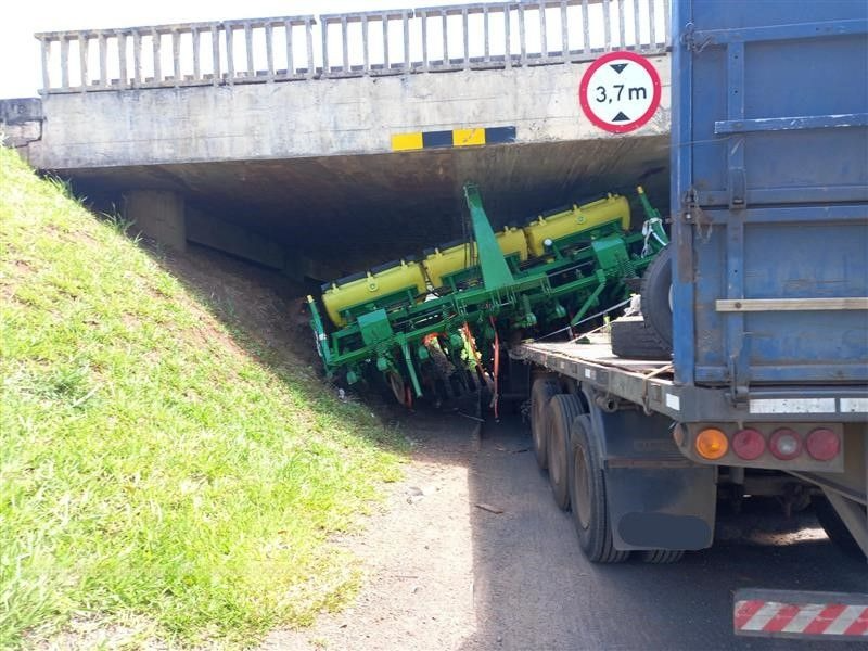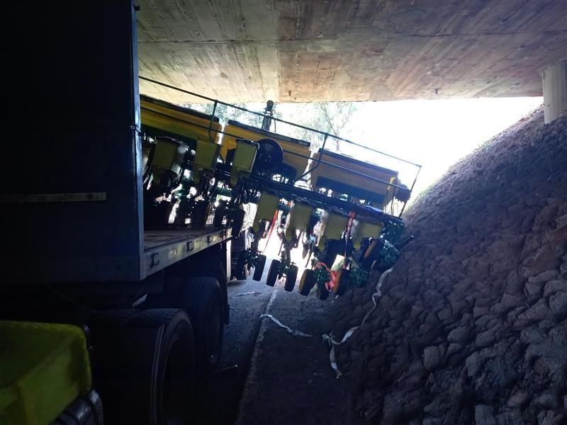 No entanto, ao passar por um viaduto- com altura máxima permitida de 3,7 metros- parte do maquinário que era transportado pela carreta deslocou-se, provocando o tombamento parcial do veículo.