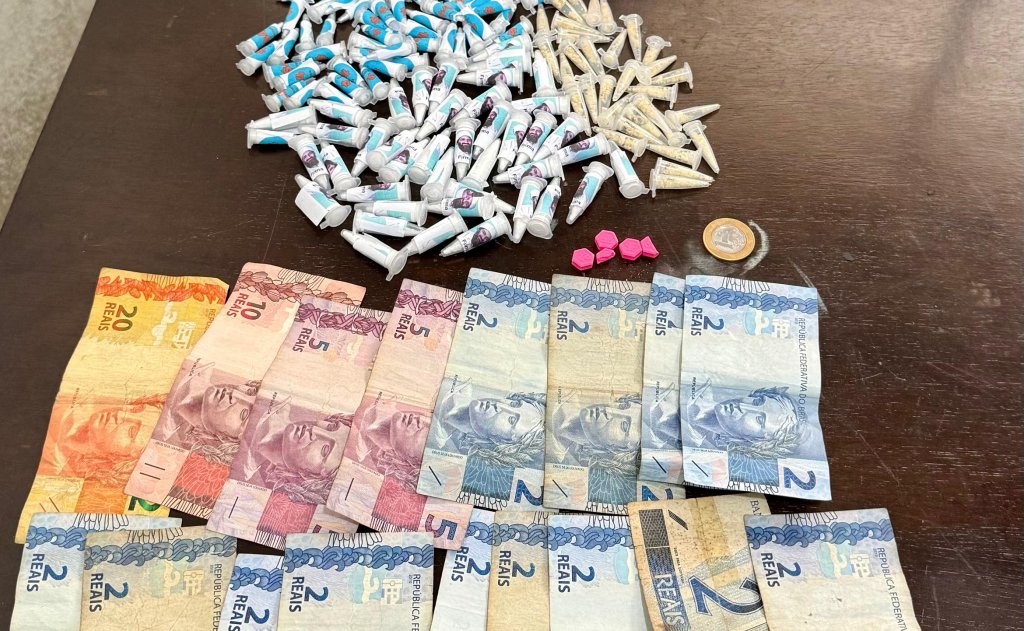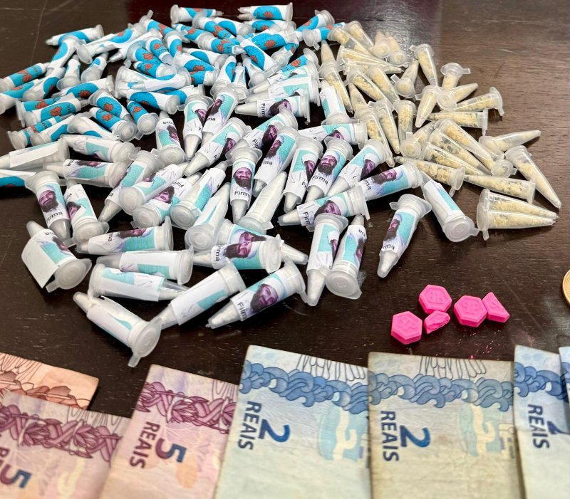 Dentro dos potes estavam pinos de cocaína, porções de crack, comprimidos de ecstasy e R$ 66 em diversas notas.