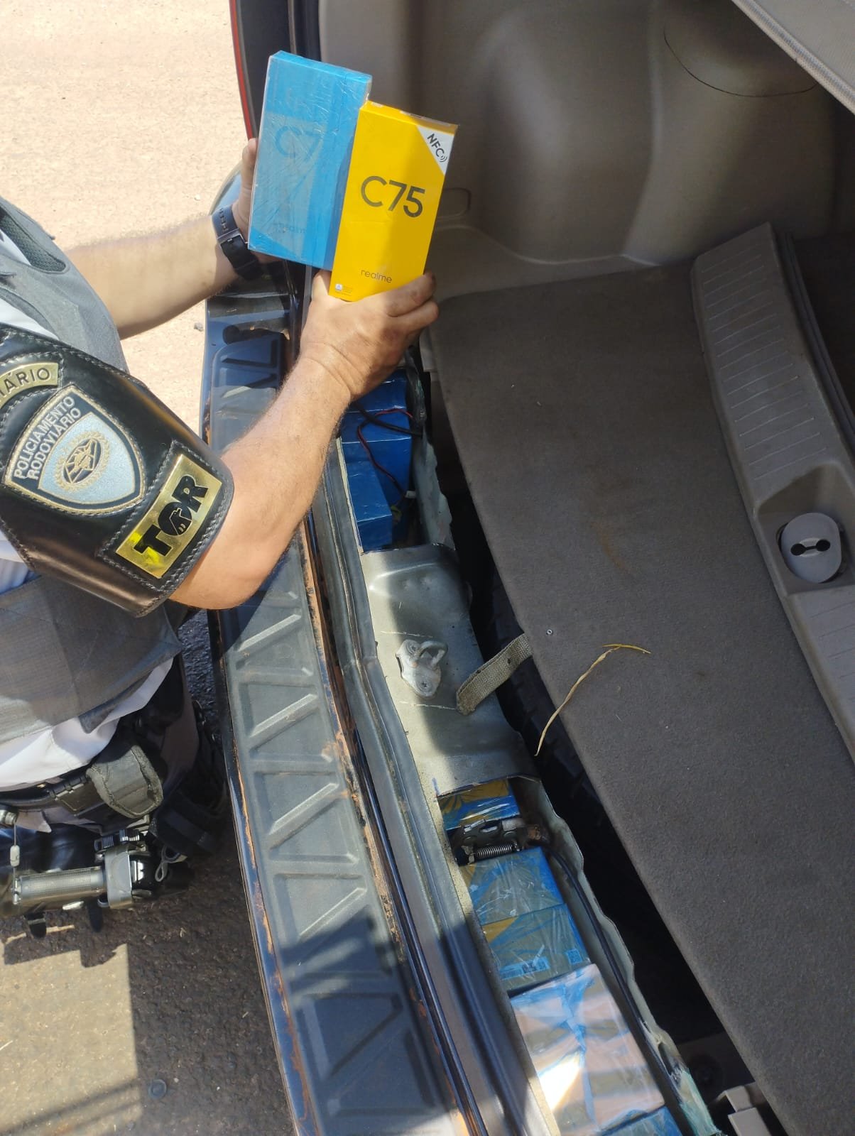 Durante a vistoria no carro, os policiais encontraram em um fundo falso, 103 celulares modelos Realme C75, sem documentação fiscal. A carga, que não possuía a devida regularização, está avaliada em R$ 62.294, segundo valores de mercado.