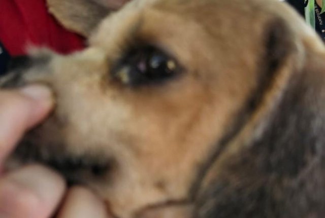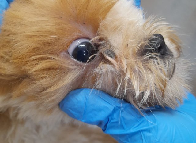 No local os animais foram encontrados em situação insalubre. Os dois filhotes estavam com alta infestação de pulgas, secreção nos olhos e irritação na pele.