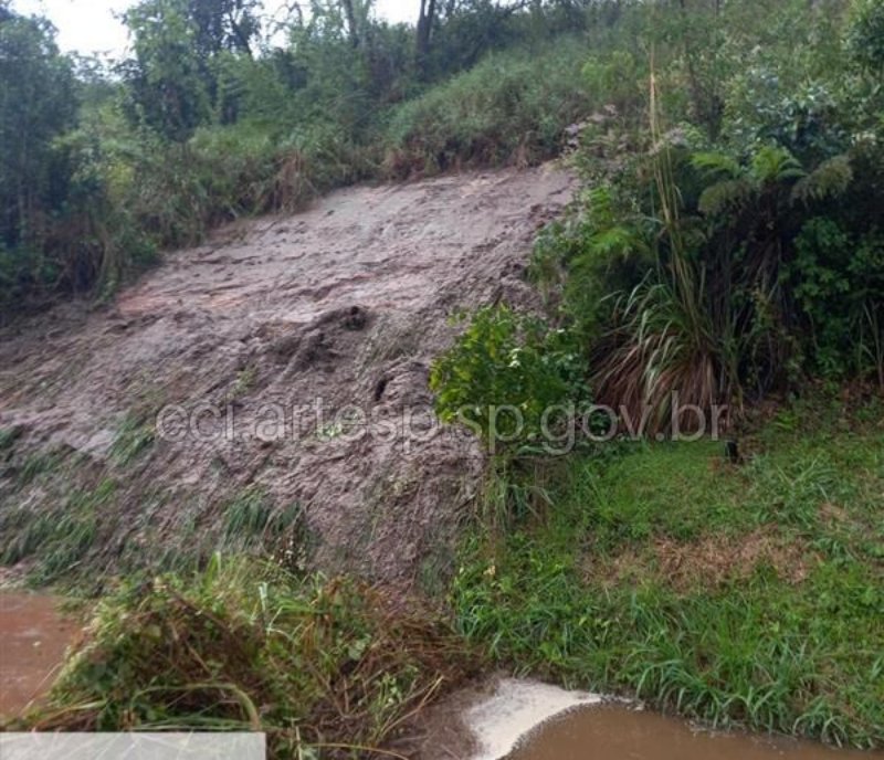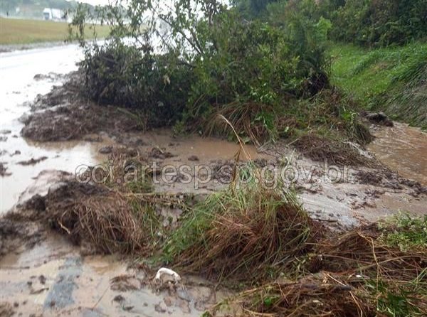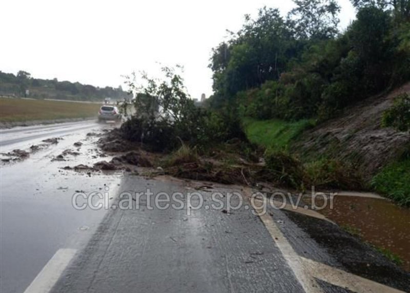 Devido a chuva que caiu sobre a região durante a tarde, parte de uma encosta cedeu. Equipes da concessionária estão no local para sinalização do tráfego e remoção da terra.