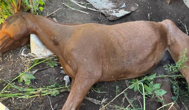 A égua foi encontrada no local agonizando no espaço por falta de alimento. Vizinhos declararam que ela se debatia horas antes em busca do que beber e comer e nisso, enroscou em uma cerca.