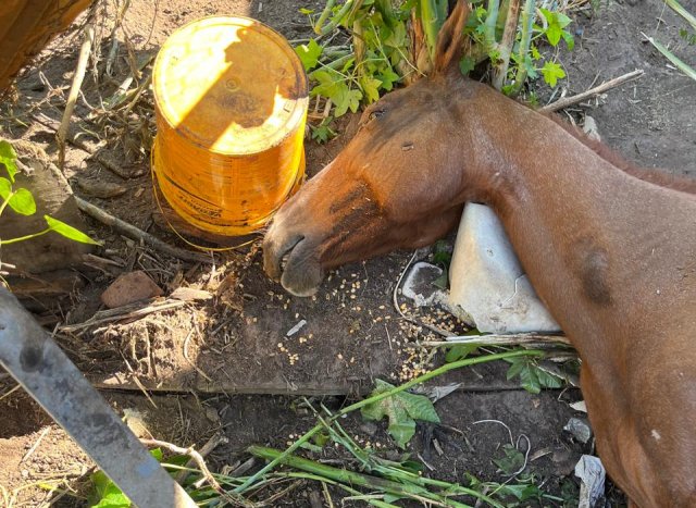Segundo consta em boletim de ocorrência, policiais foram acionados por moradores da região que denunciaram que uma égua se debatia em busca de água e alimento.