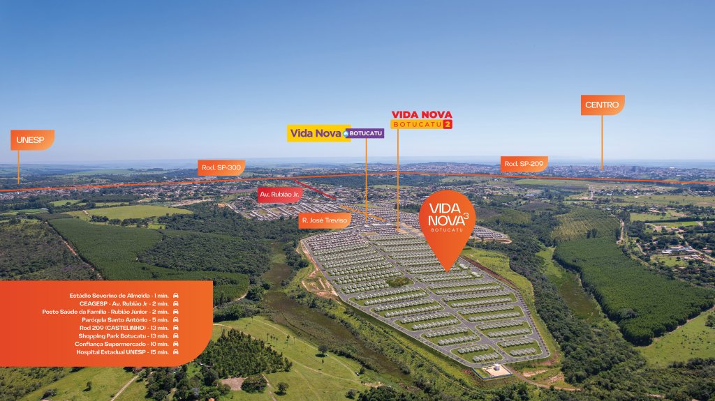 Ocupando uma área de mais de 329 mil m², o Residencial Vida Nova Botucatu 3 contará com casas de 43,85 m² construídas em terrenos a partir de 160 m², não geminadas e com possibilidade de ampliação. Os imóveis terão dois dormitórios, sala, cozinha, banheiro, área de serviço coberta, laje e piso cerâmico em todos os ambientes, além de quintal e espaço para veículo.