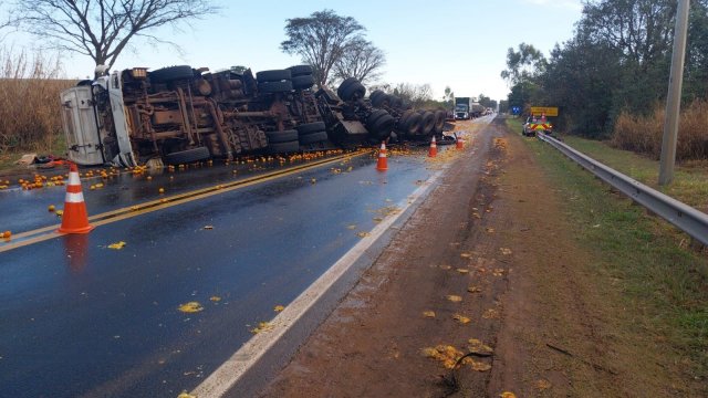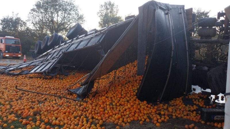 Uma carreta carregada de laranjas tombou na tarde desta sexta-feira, 25 de julho, na Rodovia João Mellão (SP 255), em Pratânia.