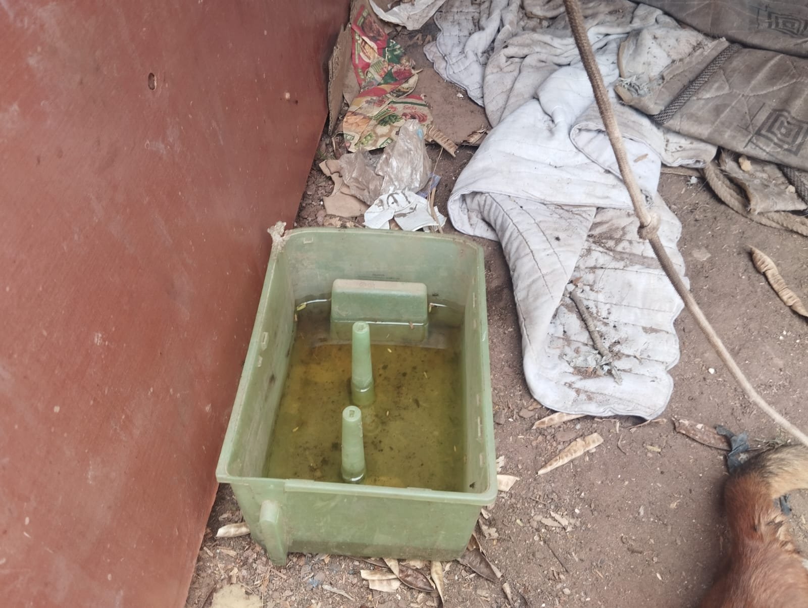 Equipe policial acompanhada de uma médica veterinária deslocou-se até o endereço onde o acusado estaria. Em um barraco foram encontrados três cachorros, sendo uma fêmea com quadro agudo de desnutrição e dois filhotes.