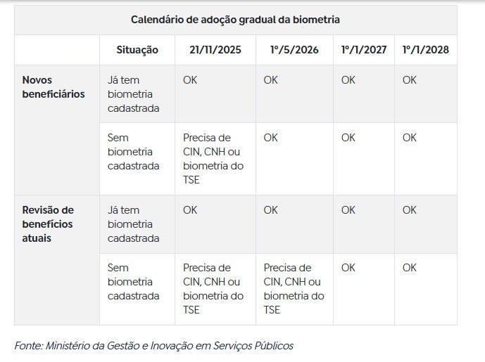 1º de janeiro de 2027 – Todas as renovações e novas concessões passam a exigir biometria. Beneficiários sem qualquer documento biométrico serão notificados e deverão emitir a CIN.