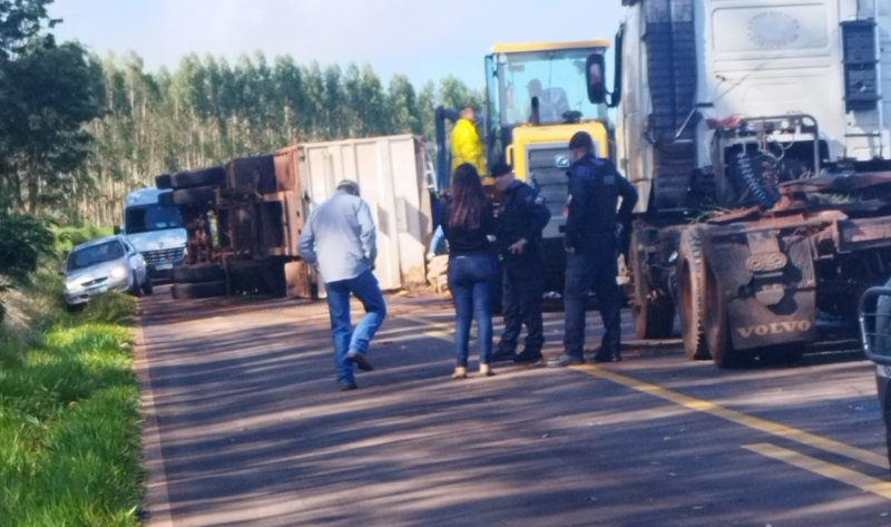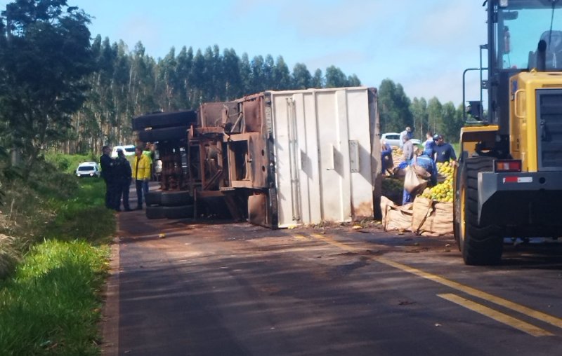 Parte da carga ficou espalhada pela pista e margens da rodovia. O veículo precisou ser destombado, o que provocou interdição da via nos dois sentidos de direção. Não houve feridos.