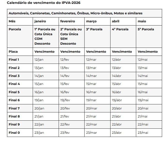 Os proprietários já podem consultar o valor venal do automóvel para 2026 no Sistema de Veículos (Sivei), uma página simplificada no site da Sefaz-SP onde basta informar a placa do veículo. Nas próximas semanas, o IPVA 2026 estará disponível para pagamento na rede bancária.