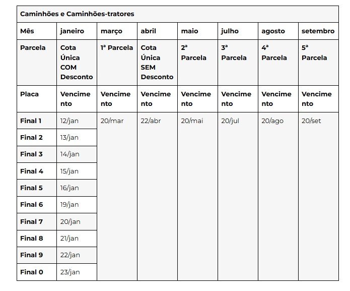 Os caminhões têm prazos diferenciados: para o pagamento integral em janeiro é concedido desconto de 3%; aos que escolherem pagar em cota única, sem desconto, é 22 de abril. Para os proprietários que optarem pelo parcelamento em três, quatro ou cinco vezes, sem desconto, os vencimentos são em 20 de março, 20 de maio, 20 de julho, 20 de agosto e 20 de setembro.