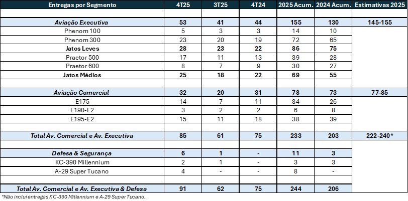 No ano de 2025, a empresa entregou um total de 244 aeronaves na Aviação Comercial, Aviação Executiva e Defesa & Segurança, acima das 206 unidades entregues no ano anterior.