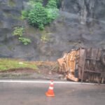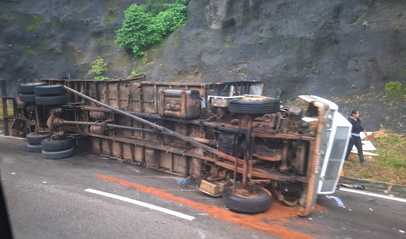 O veículo tombou lateralmente, com a carroceria invadindo a pista contrária. Parte da cabine ficou destruída. Não há informações sobre o condutor.