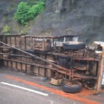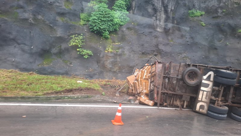 Veículo tombou lateralmente, com a carroceria invadindo a pista contrária