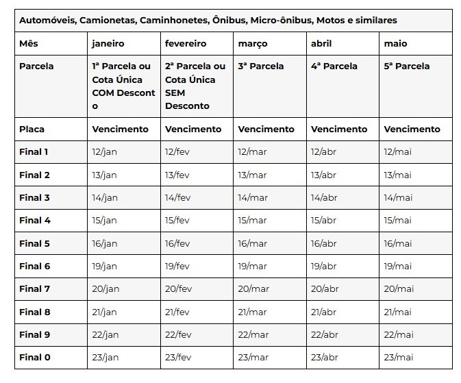 Os contribuintes devem ficar atentos às datas de vencimento. No próximo dia 12, vence o prazo para os veículos com placa final 1. No entanto, como o vencimento cai no domingo, o pagamento poderá ser feito no próximo dia útil, que é segunda-feira (13), quando vence a parcela dos veículos de placa final 2. O calendário do IPVA 2026 segue até dia 23, quando encerra o prazo para os veículos com final 0 (confira a tabela abaixo).