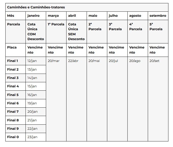 Já os proprietários de caminhões de todas as placas têm até 22 de abril para optar pela cota única sem desconto. É importante que os proprietários se atentem às datas. Após o vencimento começa a incidir juros e multa e a quebra do parcelamento.